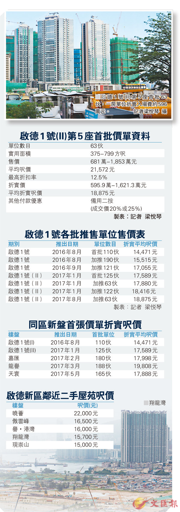 啟德1號折實均呎價18875元訊(記者 梁悅琴)面對區內持續有新盤推售,為求去貨,已屆現樓的啟德「港人港地」項目啟德1號(II)第5座首批63伙昨日克制開價,平均呎價21,572元,最高折扣率12.5%,平均折實呎價18,875元,...