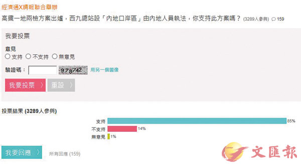 香港文匯報訊(記者 文森)經濟通及晴報在網上發起高鐵「一地兩檢」的民意調查,截至昨晚10時30分有3,330名網民參與,其中85%表示支持。網民紛紛留言指,香港不能再固步自封,兩地融合把握「一帶一路」才有出路,並批...