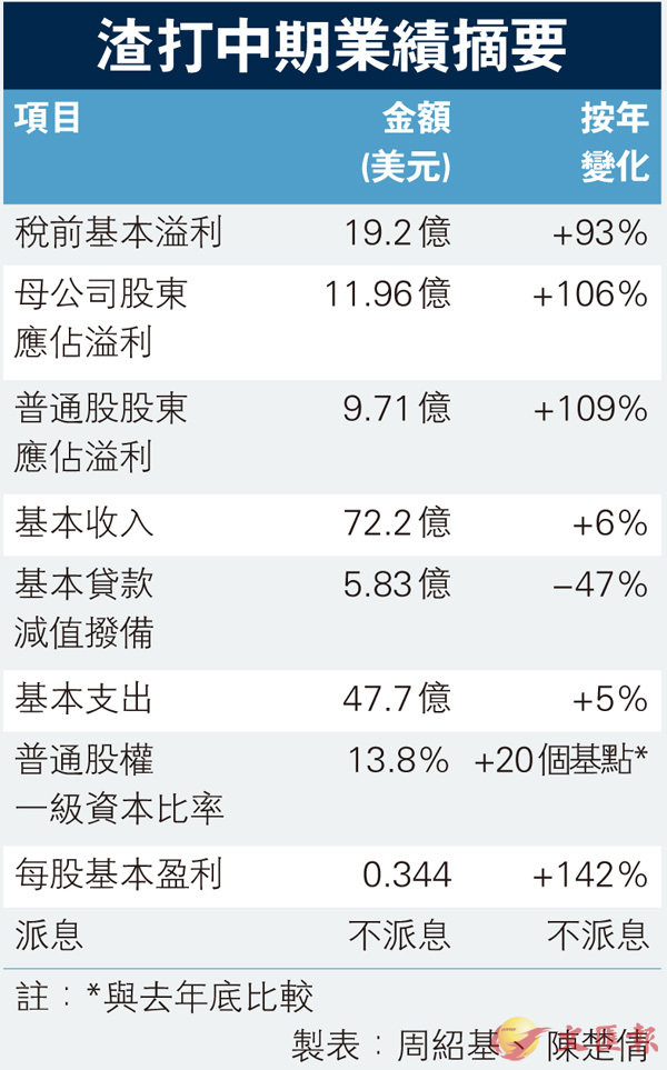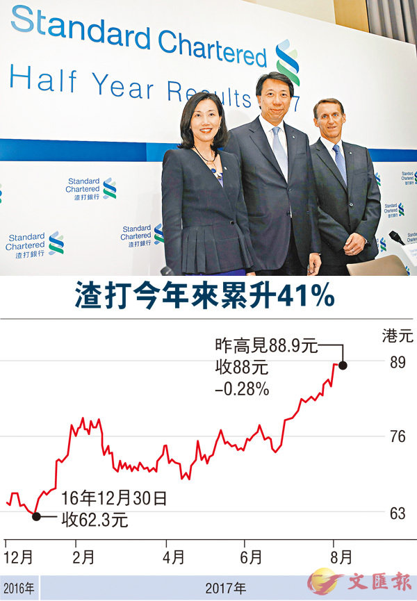 ■洪丕正(中)稱,渣打希望能盡快恢復派息。 香港文匯報記者劉國權 攝半年稅前多賺93%勝預期 年底研恢復派息香港文匯報訊 (記者 周紹基) 渣打(2888)昨公佈上半年業績,期內除稅前基本溢利按年勁增93%至19.2億美元,優...