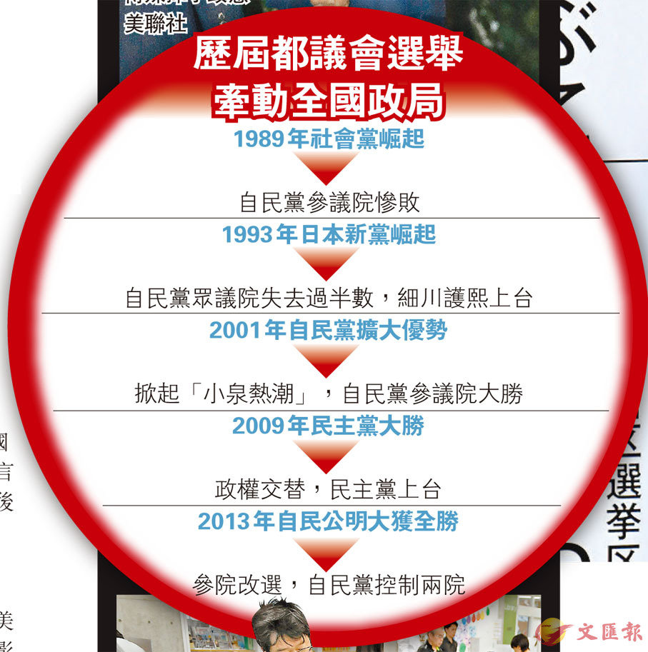 1989年社會黨崛起↓自民黨參議院慘敗1993年日本新黨崛起↓自民黨眾議院失去過半數,細川護熙上台2001年自民黨擴大優勢↓掀起「小泉熱潮」,自民黨參議院大勝2009年民主黨大勝↓政權交替,民主黨上台2013年自民公明大...