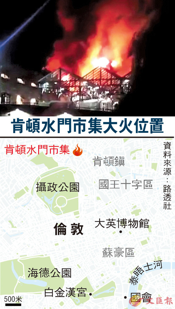 ■肯頓水門市集起火,火焰竄上夜空。 路透社二手古着唱片勝地 年吸2800萬遊客英國倫敦再發生大型火災,北部著名旅遊景點肯頓水門市集(Camden Lock Market)前晚深夜起火,市政府派出10輛消防車及70名消防員撲救,火勢...