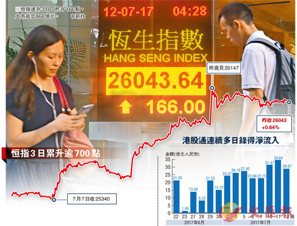 ■恒指連升3日,昨升166點,大市成交868億元。 中新社北水續湧入 恒指重上二萬六 美股中段造好香港文匯報訊 (記者 周紹基) 在內銀股等金融股繼續發力下,刺激港股連升第3日,昨日更一度升穿26,100點,升至兩年新高。...