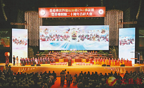 ■香港佛教界慶祝佛曆2561佛誕節暨香港回歸20周年吉祥大會。 潘達文 攝佛聯會連辦三天吉祥大會 祝願香港繁榮安定香港文匯報訊(記者 沈清麗、李摯)昨日是佛誕節。香港佛教聯合會最大型慶祝佛誕活動─「香港佛教界慶...
