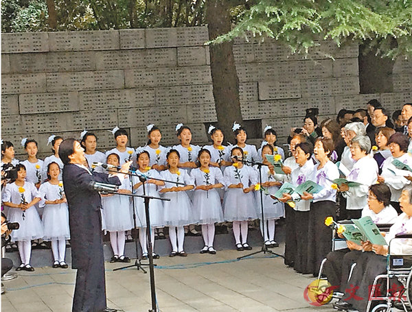 ■合唱團以一曲《和平的花紫金草》悼念死難者。 記者陳旻 攝南京「哭牆」清明祭 慘痛記憶揮之不去香港文匯報訊(記者 陳旻 南京報道)「又到了清明節,親人受害80年了,也是我們痛苦懷念的80年。」今年90歲的葛道榮,...