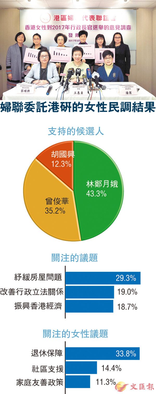 ■港區婦聯發佈行政長官選舉婦女意見調查結果。 殷翔 攝女性發聲 港研民調贏8點香港文匯報訊(記者 殷翔)距離香港特區行政長官選舉尚餘不足10天,一項調查發現,香港的女士最支持林鄭月娥任新特首。港區婦聯委託香港...