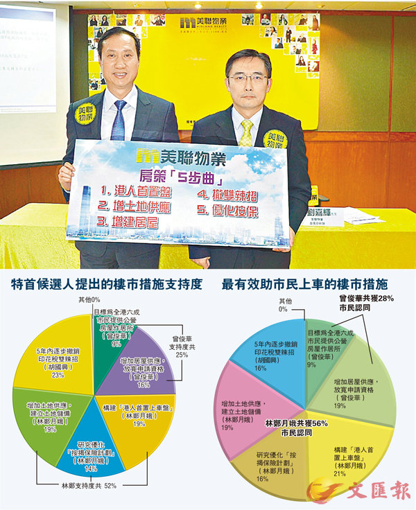 ■美聯物業住宅部行政總裁布少明(左)和首席分析師劉嘉輝(右)公佈該公司的樓市政策調查結果。「樓市措施」52%對25% 「最有效助上車」56%對28%香港文匯報訊(記者 蔡競文)房屋供應是香港市民最關注的問題之一,3名...