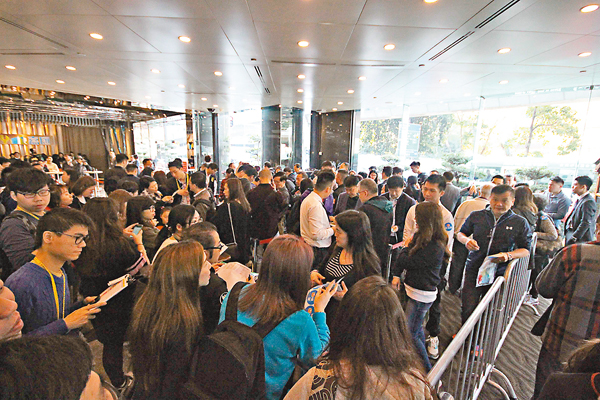 ■啟德盤推售208伙,售樓處聚集準買家及代理,場面墟。 蘇洪鏘 攝本地客豪氣逾億掃15伙 天匯2億沽兩伙香港文匯報訊(記者 蘇洪鏘)樓價攀升入瘋狂狀態,豪氣掃貨再現,新盤越賣越旺也越貴。昨天啟德發展區首個非港...
