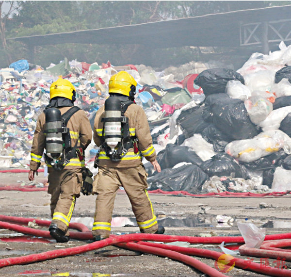 ■逾百消防員拖喉灌救逾4小時始將大火撲熄。元朗山下村一露天廢料回收場,昨日清晨發生三級大火。大量塑膠廢料起火燃燒,滾滾濃煙捲上半空,遠至數公里外均可清楚看見,現場一帶更充斥着刺鼻氣味,逾百消防員拖喉灌救...