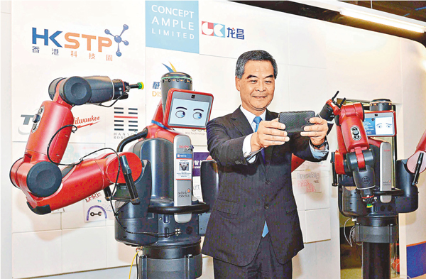 ■政府將投放180億元完善香港的創科生態系統,並繼續重點推動「再工業化」。圖為特首梁振英參觀科技應用平台展覽,並與機械人Baxter互動。 資料圖片首提稅財優惠 吸各地企業 增港競爭力香港文匯報訊(記者 鄭伊莎)為...