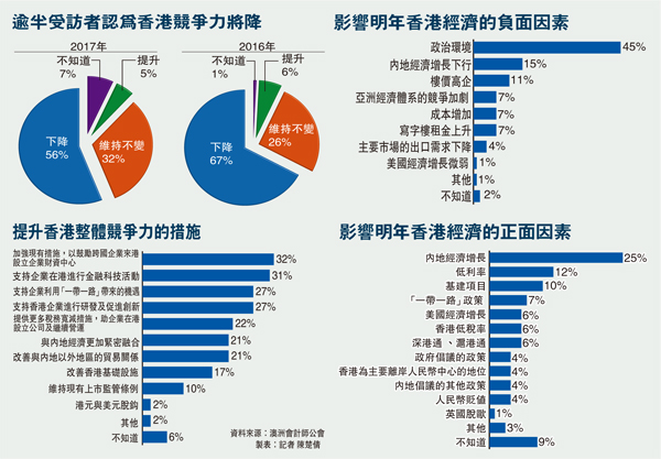 逾半受訪者看淡港競爭力 調查報告促港府發展創新香港文匯報訊(記者 陳楚倩)本港經濟前景再響起警號,一項最新調查發現,受訪者對本港經濟前景不樂觀,56%受訪者預料明年本港競爭力下降,68%人料明年經濟增長低過2%...