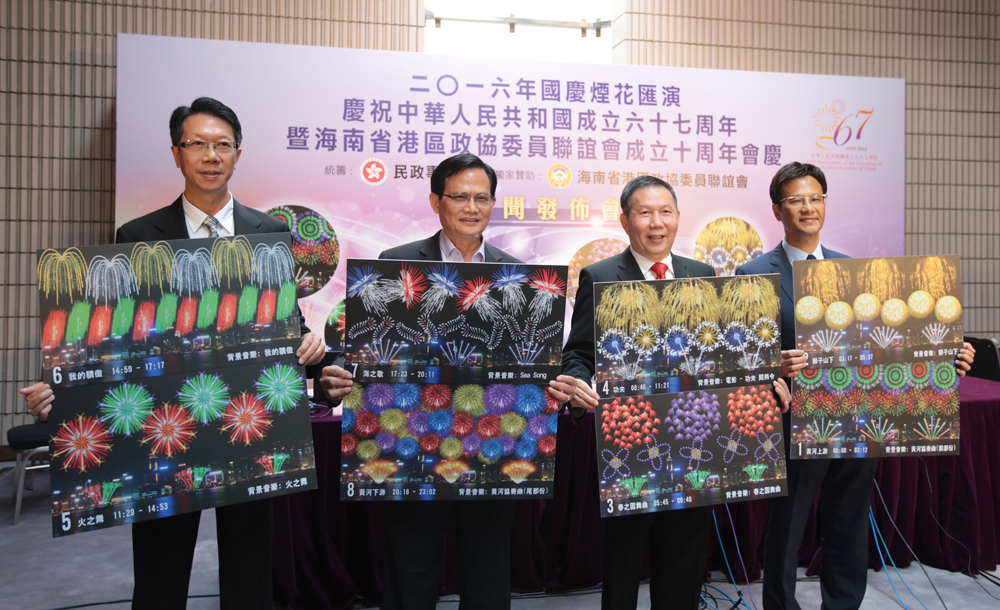 國慶煙花匯演發佈會,左為毛偉誠、左三為張學修【文匯網訊】(記者 陳文華)2016年國慶煙花匯演將於10月1日晚上9時在維港上空綻放。匯演共分8幕, 歷時23分02秒,以3艘躉船共發放23,888枚煙花。其中第七幕《海之歌》,...