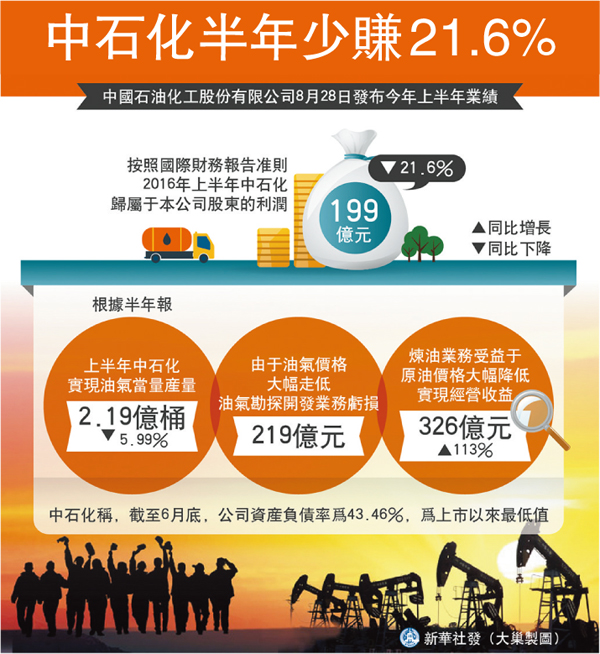 香港文匯報訊(記者 歐陽偉昉)油價下跌拖累上游業務,中石化(0386)今年上半年股東應佔利潤同比下跌21.6%至199億元(人民幣,下同);營業收入跌15.6%至8,792億元,中期息每股派0.079元,比去年同期少0.011元或12....