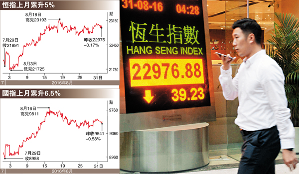 ■港股在8月最後一個交易日先升後跌,收挫39點,成交略增至692億元。 中通社國指月漲6.5%跑贏全球 後市聚焦美息走向香港文匯報訊 (記者 周紹基) 港股在8月最後一個交易日先升後跌,波幅僅123點,最終跌39點,收報22,...
