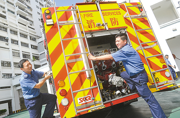■總隊目梁超琼(左)及隊目周耀明在進行消防車的日常維護工作。 梁祖彝 攝香港文匯報訊(記者 莊禮傑)上月淘大工業村迷你倉四級火警共焚燒108小時,消防員也連續搏鬥了108小時。在火場內長期工作的人員固然值得市民尊...