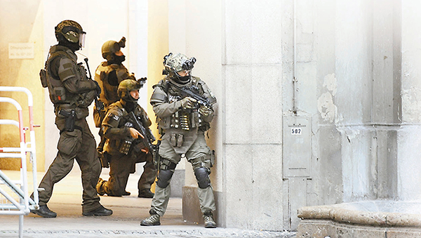 ■警方大舉搜捕兇徒。德國南部繼上周火車斬人案後,發生更嚴重的「獨狼式」襲擊。18歲德國籍伊朗裔青年松博利前日傍晚先在慕尼黑一間麥當勞快餐店內向兒童開槍,及後走到街上向途人亂槍掃射,再走入一間商場施襲,至...