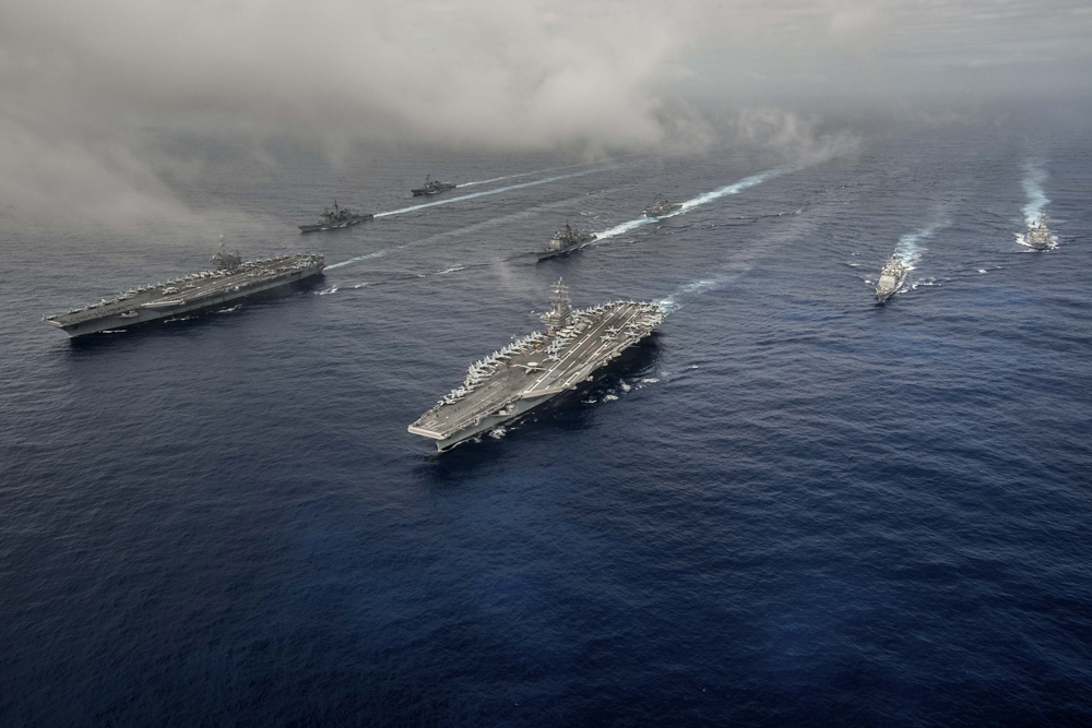圖:6月18日,美國海軍核動力航母「斯坦尼斯」號及「里根」號組成雙航母戰鬥群,高調駛進中國南海附近海域軍演,挑釁意味甚濃\\資料圖片【大公報記者 張寶峰】自菲律賓將南海問題提交國際仲裁以來,身為域外一方的美...