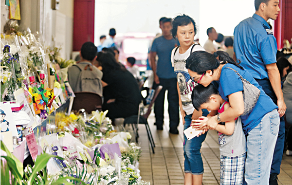 ■家長帶同小朋友前往觀塘消防局憑弔殉職的消防英雄-高級消防隊長張耀升和消防隊目許志傑。莫雪芝 攝香港文匯報訊(記者 陳文華)九龍灣迷你倉火災焚燒108小時終撲滅。消防處昨日撤離,現場由警方接手。受火災影響停...