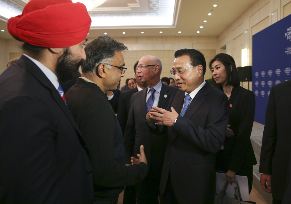 圖:28日,中國國務院總理李克強在天津同出席2016年夏季達沃斯論壇的企業家代表進行對話 中新社【大公報訊】中國國務院總理李克強28日在天津與出席2016年夏季達沃斯論壇的中外企業家代表對話交流。談及中國資本市場發...