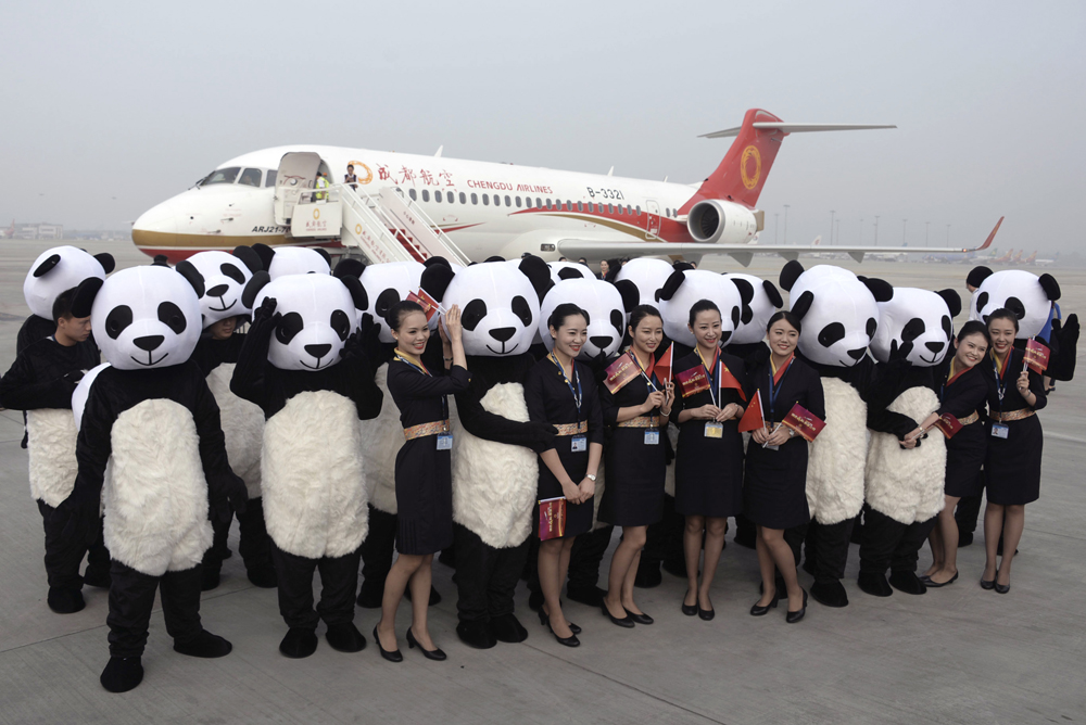 扮成熊貓的工作人員紀念ARJ21-700投入商業運營 美聯社大公網6月29日訊 據新華社、中新社報道:6月28日11時37分,EU6679航班平穩降落在上海虹橋機場,這是成都航空首條成都─上海航線。而更特別的是,此次航班由中國國...