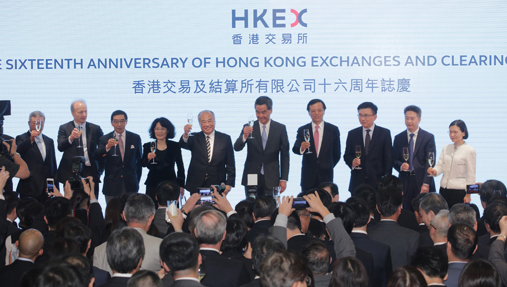 圖:港交所昨日舉行上市16周年酒會,行政長官梁振英(右五)、港交所主席周松崗(左五)、港交所行政總裁李小加(右四)、財經事務及庫務局局長陳家強(右三)等出席 大公報記者林少權攝在外圍帶動下,港股連續第二日...