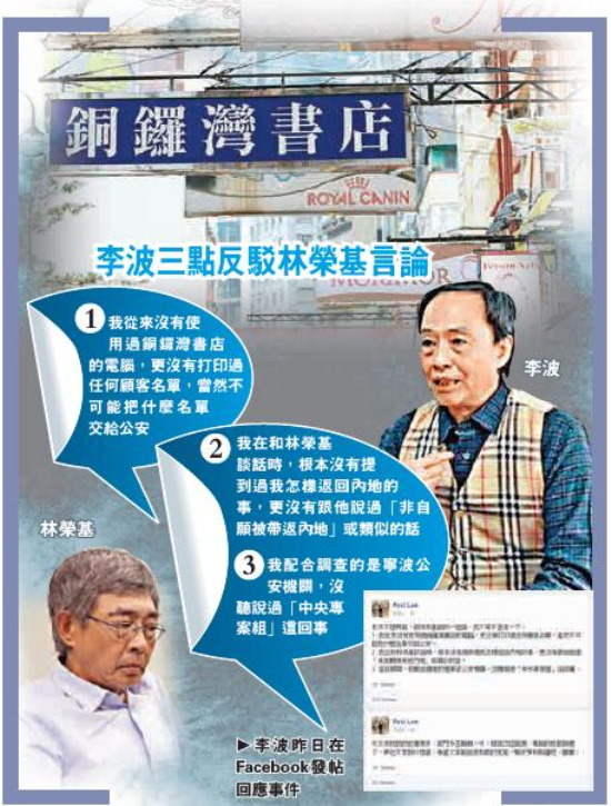 李波反驳林荣基跨境执法言论。大公网6月18日讯(记者 龚学鸣、陈达坚、冼国强)离港多月的铜锣湾书店店长林荣基,周二返港要求警方就其失踪案件销案后,前日忽然向传媒交代自己身处内地期间的所谓“内情”,又声称书...