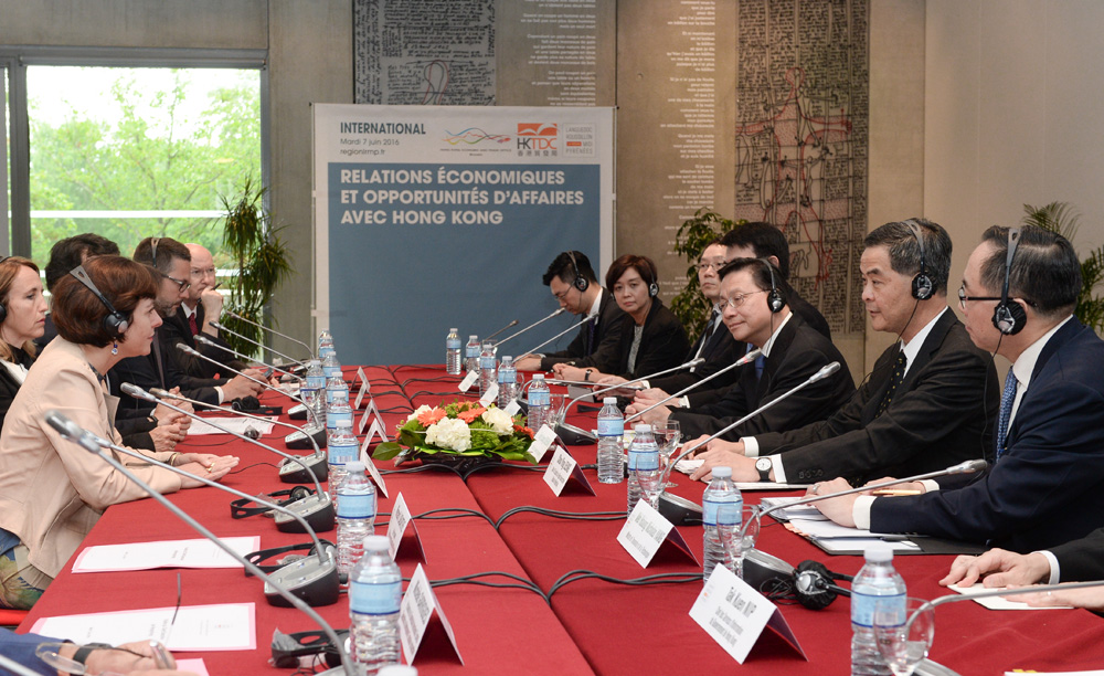 梁振英(右二)與Carole Delga(左一)會面,了解圖盧茲在航空、工程、創新及科技的最新發展大公網6月8日訊 (記者 龔學鳴)行政長官梁振英昨日(圖盧茲時間六月七日)展開在法國的官式訪問,抵達歐洲航天航空中心圖...