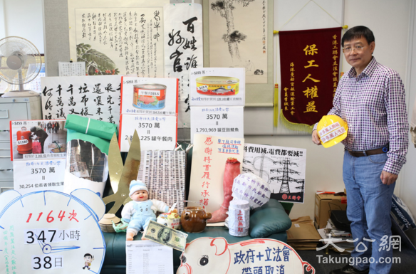 圖:王國興展示部分曾在立法會發言時使用過的道具,笑言他日可以用來舉辦展覽\\大公報記者蔡文豪攝大公網6月8日訊(記者許嘉信)距離立法會換屆選舉尚餘不足三個月,各路參選大軍逐漸成形。其中,政圈盛傳建制派將合...