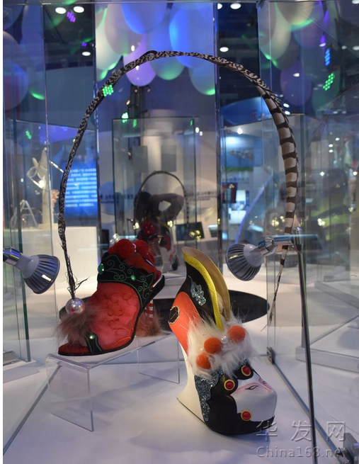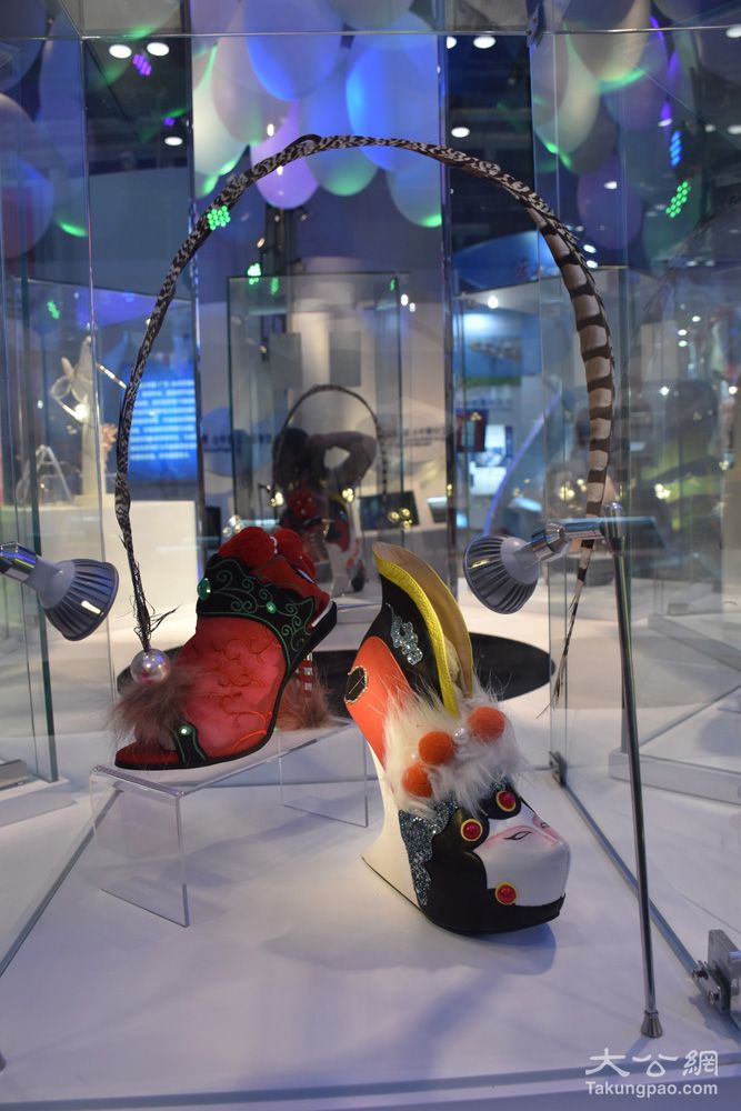 圖:香港展區內一雙京劇臉譜風格的高跟鞋/大公報記者張寶峰攝大公網5月29日北京訊(記者張寶峰)在28日開幕的京交會上,各地方展區紛紛秀出特色、爭奇鬥豔。香港展區今年別出心裁:以絲帶串起數十個大號氣球來裝點整...