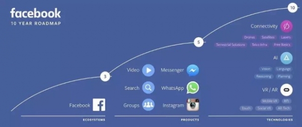 Facebook在三藩市舉行F8年度開發者大會。Facebook CEO馬克•紮克伯格公佈了10年發展路線規劃圖:Facebook從社交網站,變成了即時消息(Messenger和Whatsapp)、圖片分享(Instagram)、興趣群組(Group)、視頻(Vid...