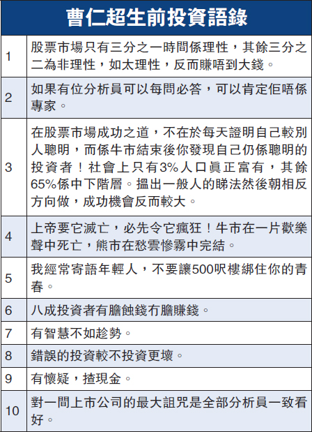 "香港股神"曹仁超去世享年68岁 曾寄语勿用钱衡量成败