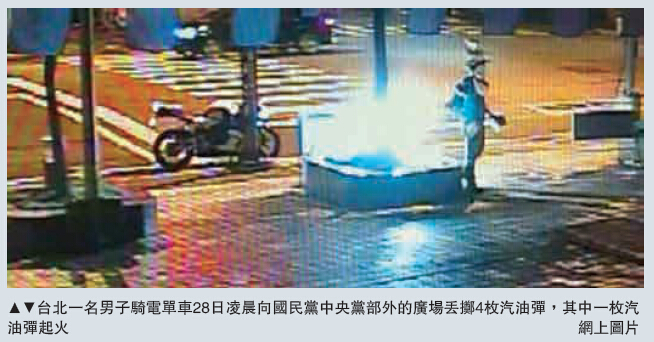 大公网2月29日讯 综合中通社及中央社报道:中国国民党位于台北的中央党部28日凌晨遭人丢掷汽油弹纵火,所幸无人伤亡,但现场散发多张文宣,当天是“二二八”事件69周年纪念日,警方不排除是刻意纵火。国民党代理主席...
