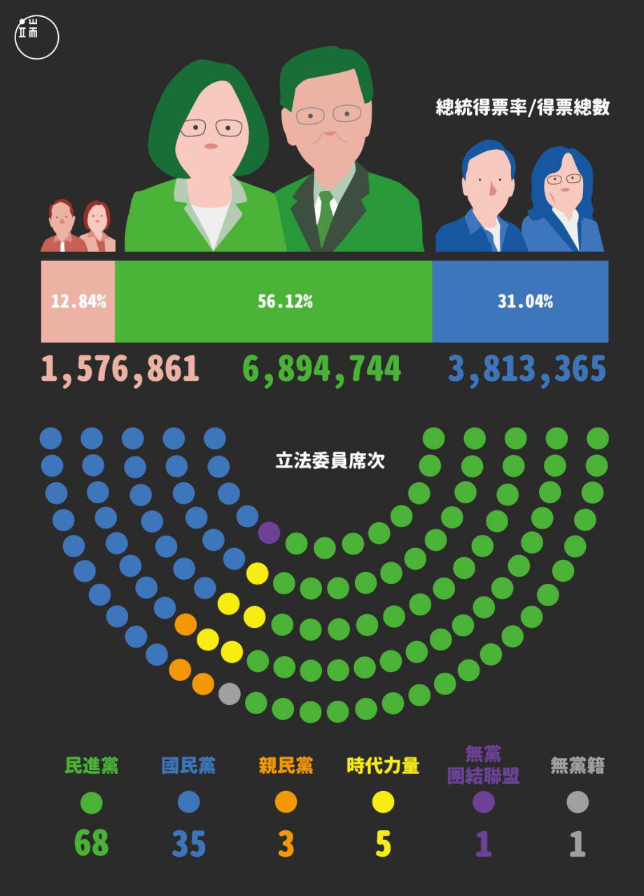 台湾“中央选举委员会”周六晚间发布了大选的正式结果:蔡英文当选中华民国第十四任总 统,民进党拿下过半的68席立委,首度实现了完全执政。一张图看完台湾大选结果。图:端传媒设计部除了总统当选人、得票率和各政党...