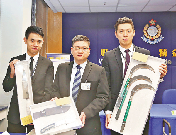 ■警展示檢獲的部分武器。香港文匯報訊 (記者 杜法祖) 元朗黑社會招收學生從事非法活動,在公園及屋等地利誘少年加入,警方覷準其不軌企圖展開「天歲」行動,3日前開始在區內拘捕78人,當中包括10名學生,並檢獲大...
