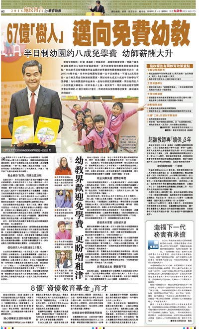 香港文匯報訊(記者 姜嘉軒)特區政府一直重視教育發展,特區行政長官梁振英昨日公佈新年度施政報告,其中經濟發展和教育新措施都是重點,包括家長及幼稚園業界最為關注的免費幼稚園教育細節終於出台。由2017/18學年...