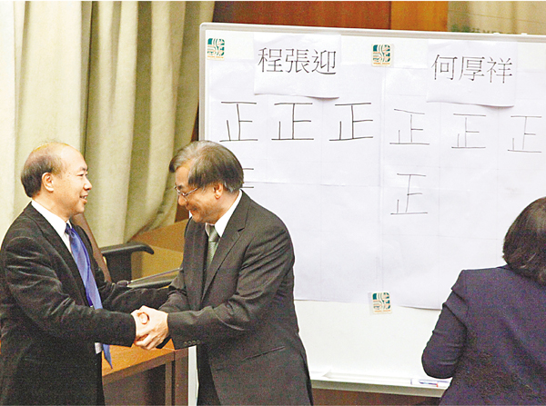 ■何厚祥(左一)當選沙田區議會主席,並與程張迎握手。 曾慶威 攝和而不同合作為民贏反對派一票 何厚祥彭長緯續掌沙田香港文匯報訊(記者 陳庭佳)中西區、荃灣、北區及沙田區議會昨日選出新一屆正副主席,全數由建...