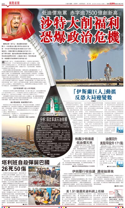 低油價拖累 赤字逾7500億創新高國際油價一瀉不止,產油國財政備受壓力,中東產油大國沙特阿拉伯前日宣佈,今年赤字預料高達980億美元(約7,595億港元),相當於國內生產總值(GDP)的15%,創下歷年新高。鑑於油價短期內預...