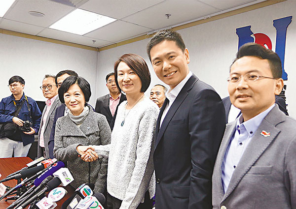■葉劉淑儀支持周浩鼎(右二)出戰新界東補選。莫雪芝 攝香港文匯報訊(記者鄭治祖)各政團積極籌備參與將於2月28日舉行的立法會新界東議席補選。民建聯現正積極考慮派出副主席周浩鼎出選,昨日先與新民黨會面爭取支...