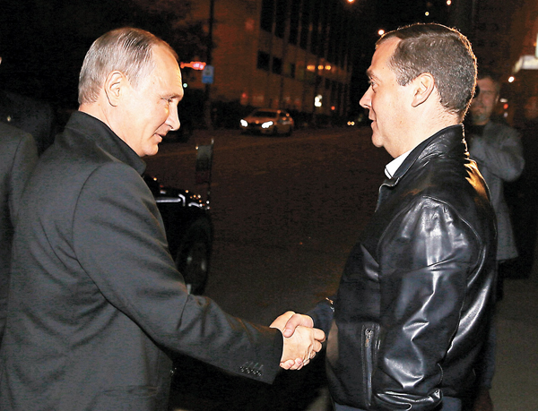■普京(左)與總理梅德韋傑夫握手。法新社俄羅斯執政「統一俄羅斯」黨在前日的國會下議院選舉大勝,在點算了98.3%選票後,該黨預計在總數450席中至少拿下343席,比上屆238席大幅增加,成為議會大多數,足以推動修憲。...
