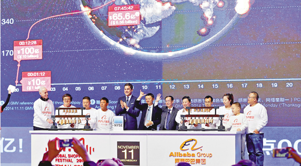 ■紐交所在北京水立方舉行遠程開市敲鐘儀式。紐交所總裁Tom Farley(左五)與馬雲(左六)等嘉賓主持儀式。 美聯社3000萬人搶購國際品牌 阿里股價中段跌1.85%香港文匯報訊(記者 海巖 北京報道)作為阿里巴巴國際化元...