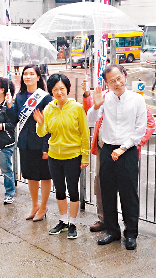■江玉歡昨日無懼風雨,到康山選區舉行競選活動,向市民積極拉票。新民黨主席葉劉淑儀及立法會主席曾鈺成到場支持。香港文匯報訊(記者鄭治祖)尚餘8天便是區議會選舉投票的日子,各候選人把握最後時機,努力落區接觸...