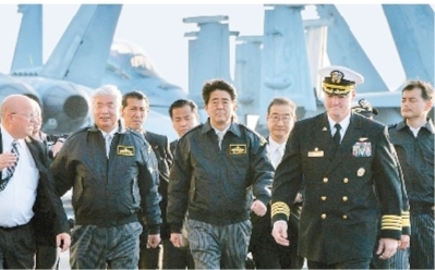 日本首相安倍(中)18日參觀美海軍“裡根”號航母。中評社北京10月26日電/日本與美國最近在多個公開場合大秀同盟關係,私底下卻因駐日美軍經費問題產生不快。日本媒體披露,日本政府要求大幅削...
