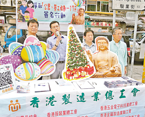 ■工聯會理事長吳秋北昨日落區,呼籲市民簽名,支持劃一假期。 翁麗娜 攝80萬「藍領」無佛無聖無復活 吳秋北批「假有別」分化社會香港文匯報訊(記者 翁麗娜)現時全港約30%僱員每年只有12天勞工假期,其餘則享有17天...