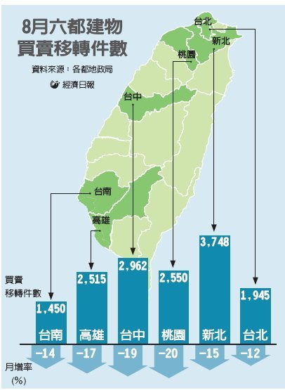 8月六都交易量全面走跌,受到經濟不景氣、連續風災雨勢不斷以及農曆民俗月等多重因素影響,整體交易量縮達16.8%,與去年同期比較更量縮18.3%...