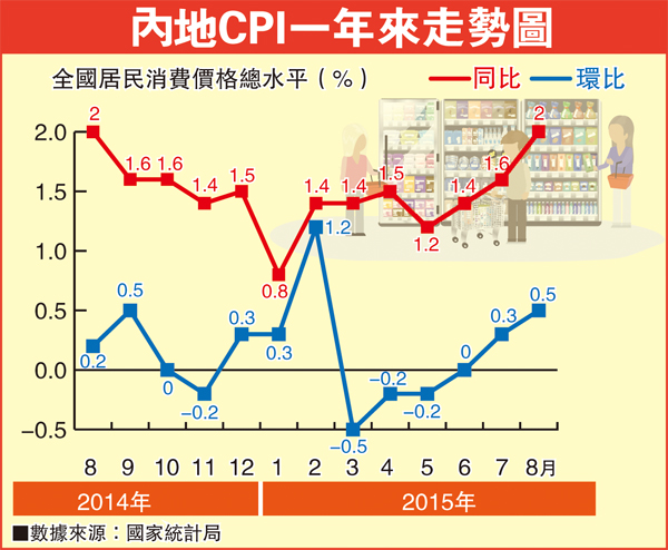 )國家統計局昨日發佈最新數據顯示,主要受豬肉、蛋等食品價格大幅上漲的影響,8月內地居民消費價格(CPI)同比上漲2%,創今年以來新高。值得注意的是,作為通脹衡量標準的CPI同比漲幅,超過了1.75%的一年期存款基準...