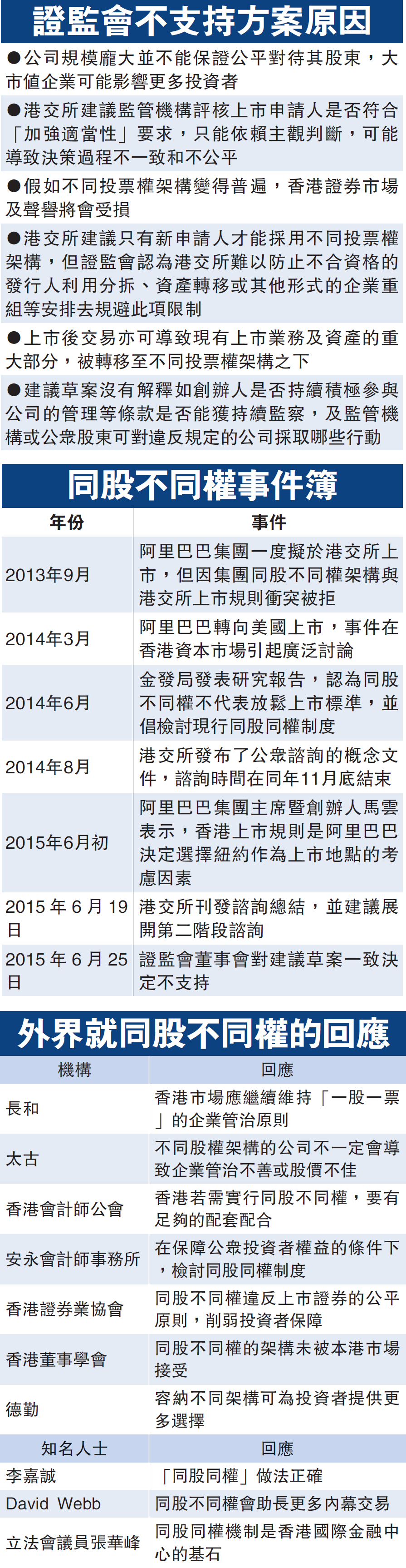 港交所(00388)不同投票權架構第二輪咨詢未啟航已觸礁,繼長和(00001)主席李嘉誠表示不認同“同股不同權”後,證監會昨日罕有地發表措詞強硬聲明,稱董事局壹致決定不支持不同投票權架構在聯交所作主要上市,證監...