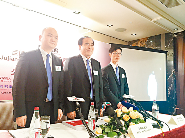 ■巨匠建設董事長兼總經理呂耀能(中)出席記者會。陳楚倩 攝香港文匯報訊(記者 陳楚倩)2016年第一隻跨年招股的IPO,浙江嘉興建築商巨匠建設(1459)今日起至下月5日招股,合共發售約1.33億股H股,當中一成在本港公開...