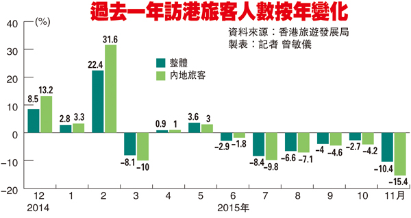 香港文匯報訊(記者 曾敏儀)本港旅遊業曾經風光一時,但自今年6月起整體訪港旅客人數連續6個月下跌,11月更按年急跌10.4%,其中致命因素是內地旅客大幅減少,按年暴瀉15.4%。業界人士擔心,隨美國步入加息周期,港...