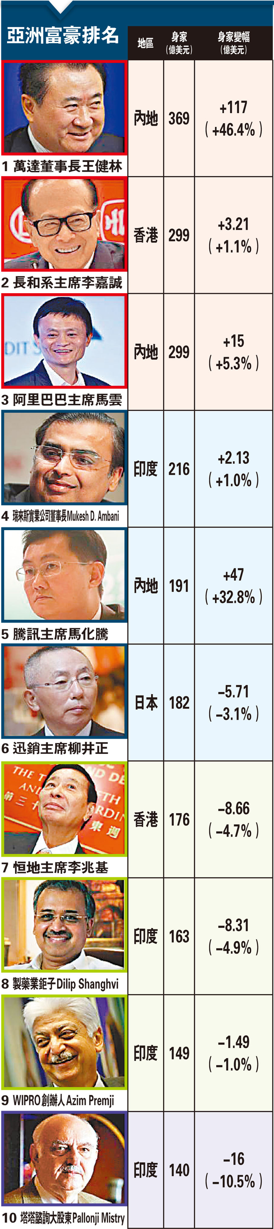 亞洲富豪排名世界富豪身家縮1482億 兩地首富財富逆市增香港文匯報訊(記者 涂若奔)過去一年全球股市風雲變幻,大宗商品價格的下跌和中國經濟放緩,都令全球投資者深受困擾,就連億萬富豪也不例外。彭博億萬富豪榜中...
