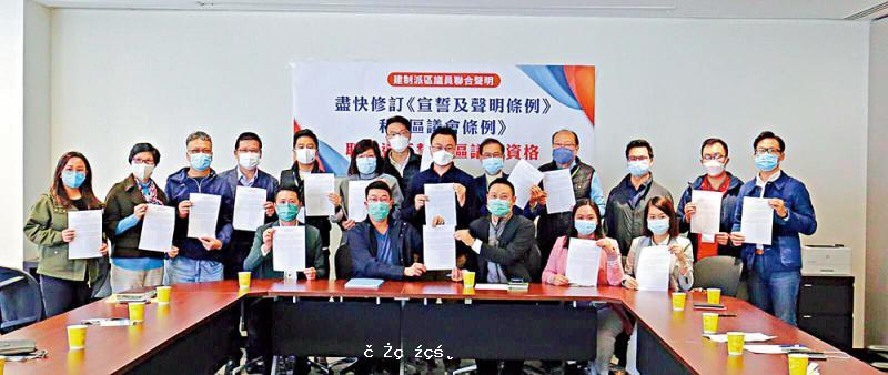 圖:86位建制派區議員簽署聯合聲明,要求盡快修訂《宣誓及聲明條例》和《區議會條例》,取消違反誓言區議員的資格。...