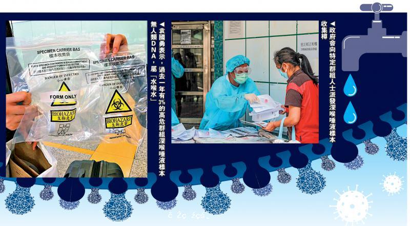 圖:政府會向特定群組人士派發深喉唾液樣本收集樽 新冠肺炎疫情未受控,社區再現爆疫隱患。政府專家顧問、香港大學微生物學系講座教授袁國勇昨日透露,過去一年有3%高危群組深喉唾液樣本(推算約1.8萬個)驗出無人...